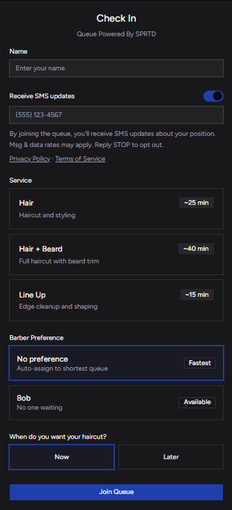 Every customer who walks out without saying a word is a customer you never knew you lost. SPRTD Queue gives your shop real-time transparency — customers check in, get an SMS with their place in line, and come back when it's their turn. No app to download. No new habits for your barbers. Just a shop that respects people's time.